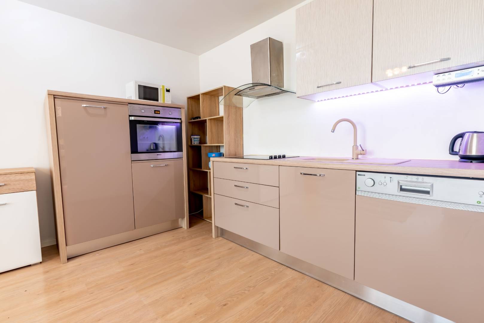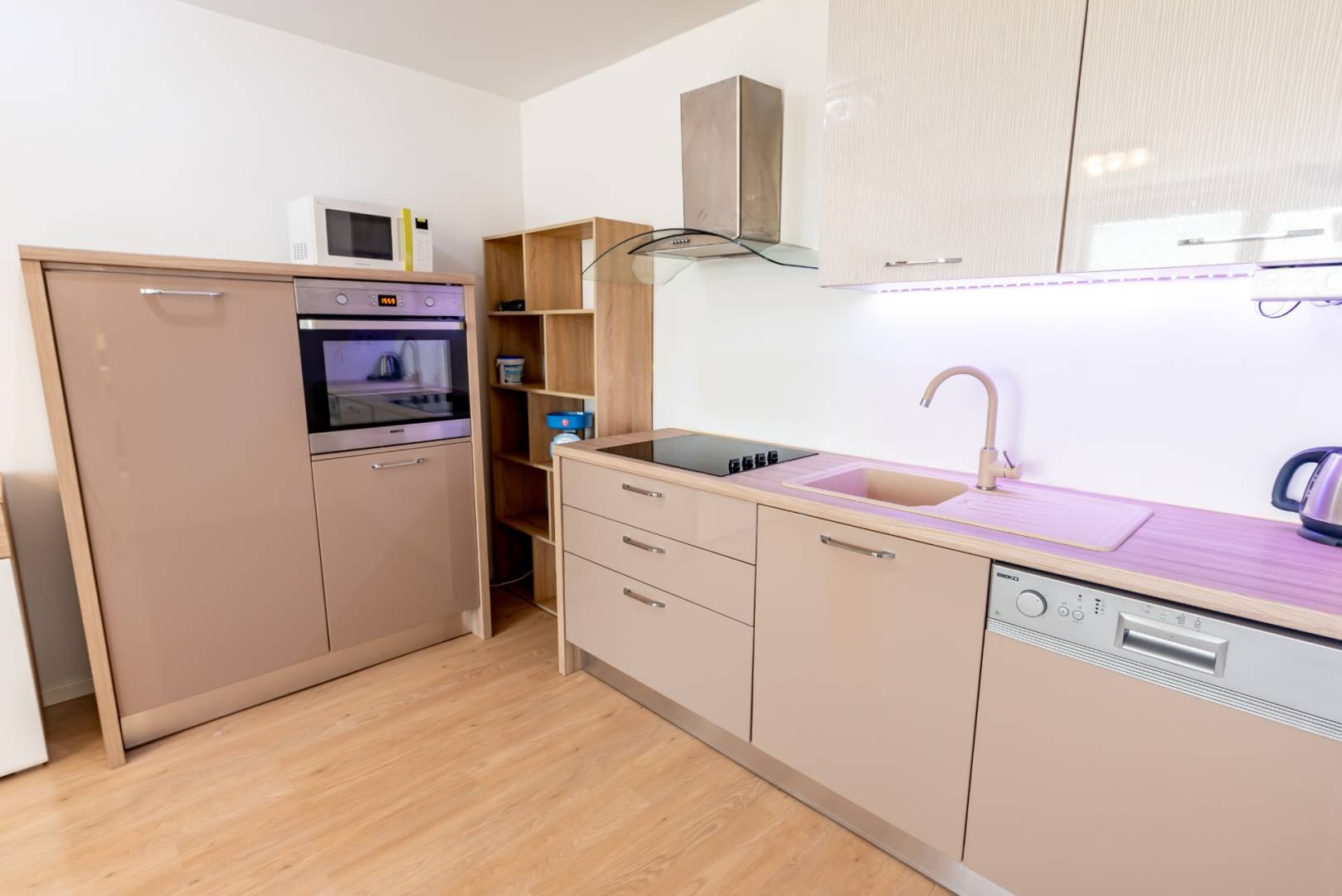 • Kuchynská linka s vstavanými spotrebičmi: elektrická rúra, elektrická varná doska, umývačka riadu, odsávač pár