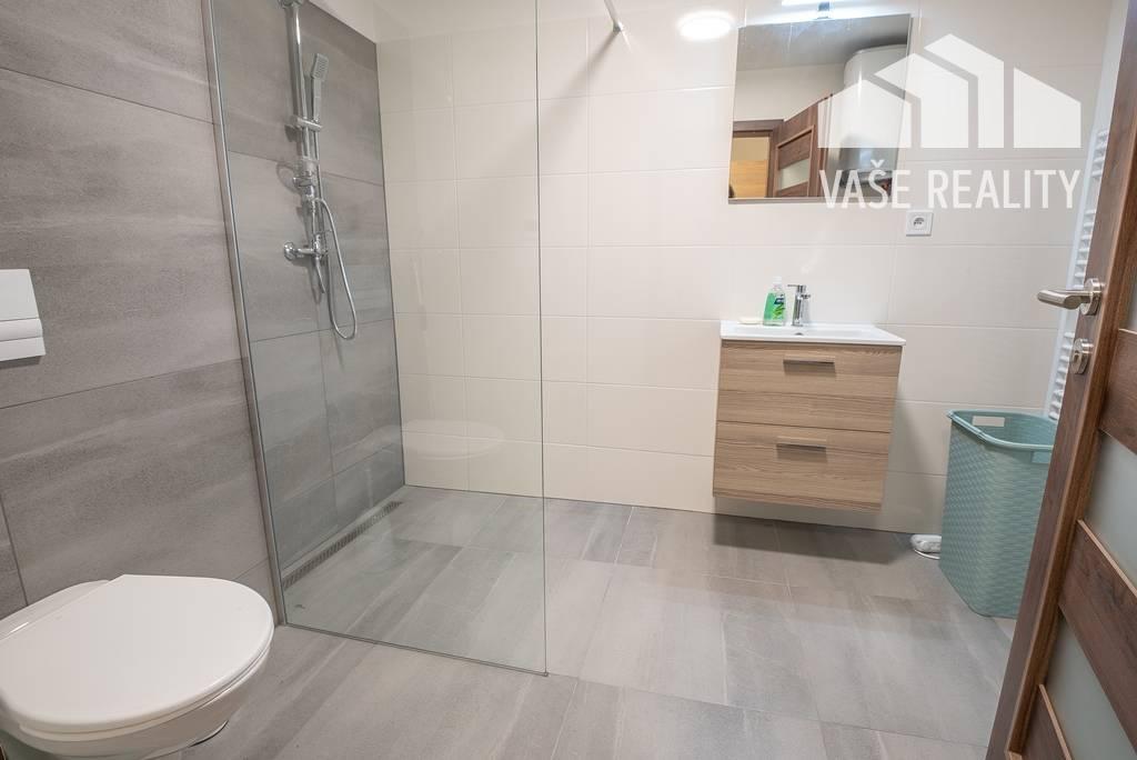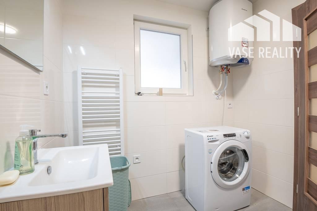 Kúpeľňa: bezbariérový sprchový kút, WC, umývadlo so skrinkou, zrkadlo, práčka, kotol na ohrev vody