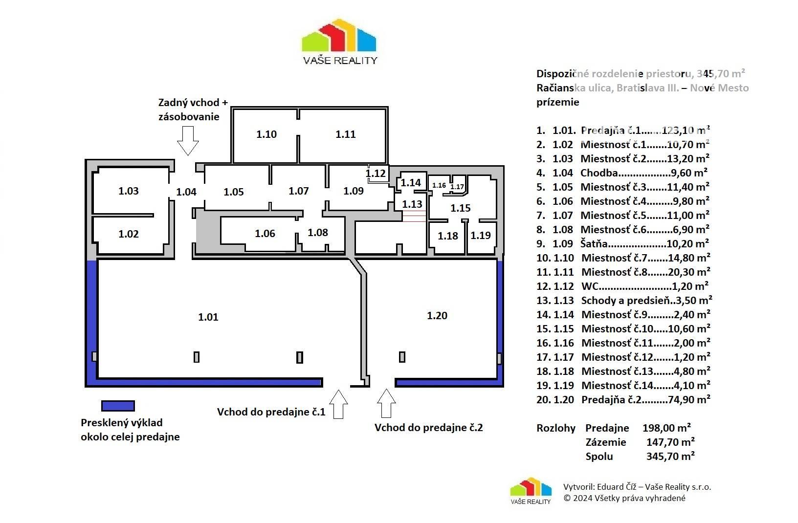 • Celková rozloha 345,70 m² (predajňa 198,00 m² + zázemie 147,70 m²)