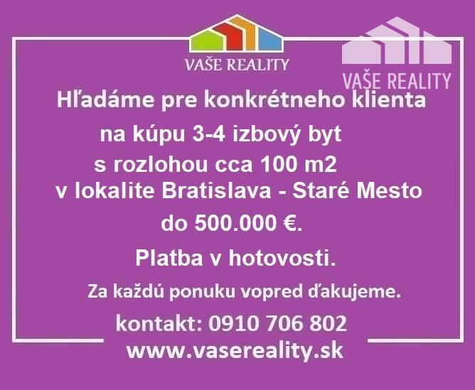 Ak máte na predaj 3 a viac izbový byt v lokalite Bratislava - Staré Mesto, ktorý spĺňa vyššie uvedené požiadavky, neváhajte nás kontaktovať. Radi sa s vami dohodneme na osobnej schôdzke a preberieme ďalšie detaily.