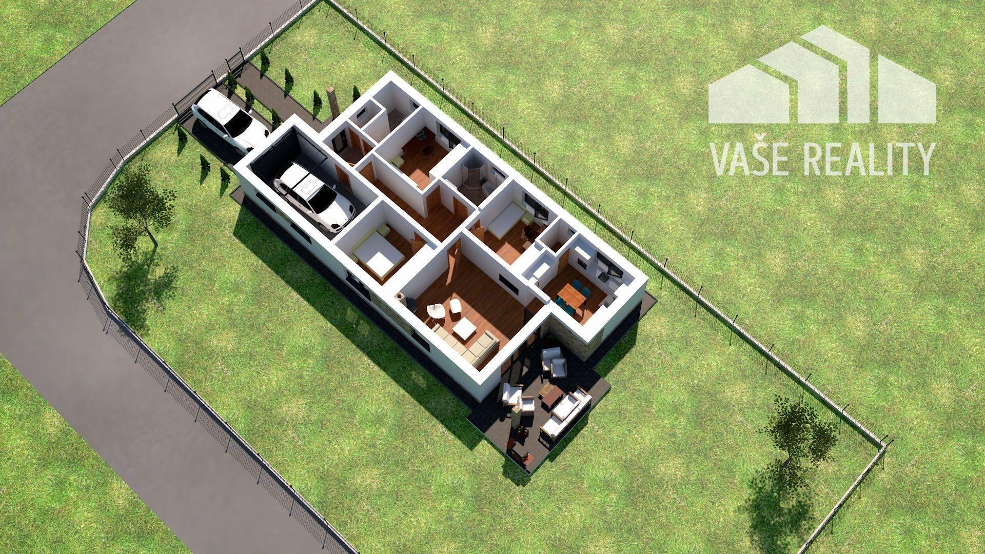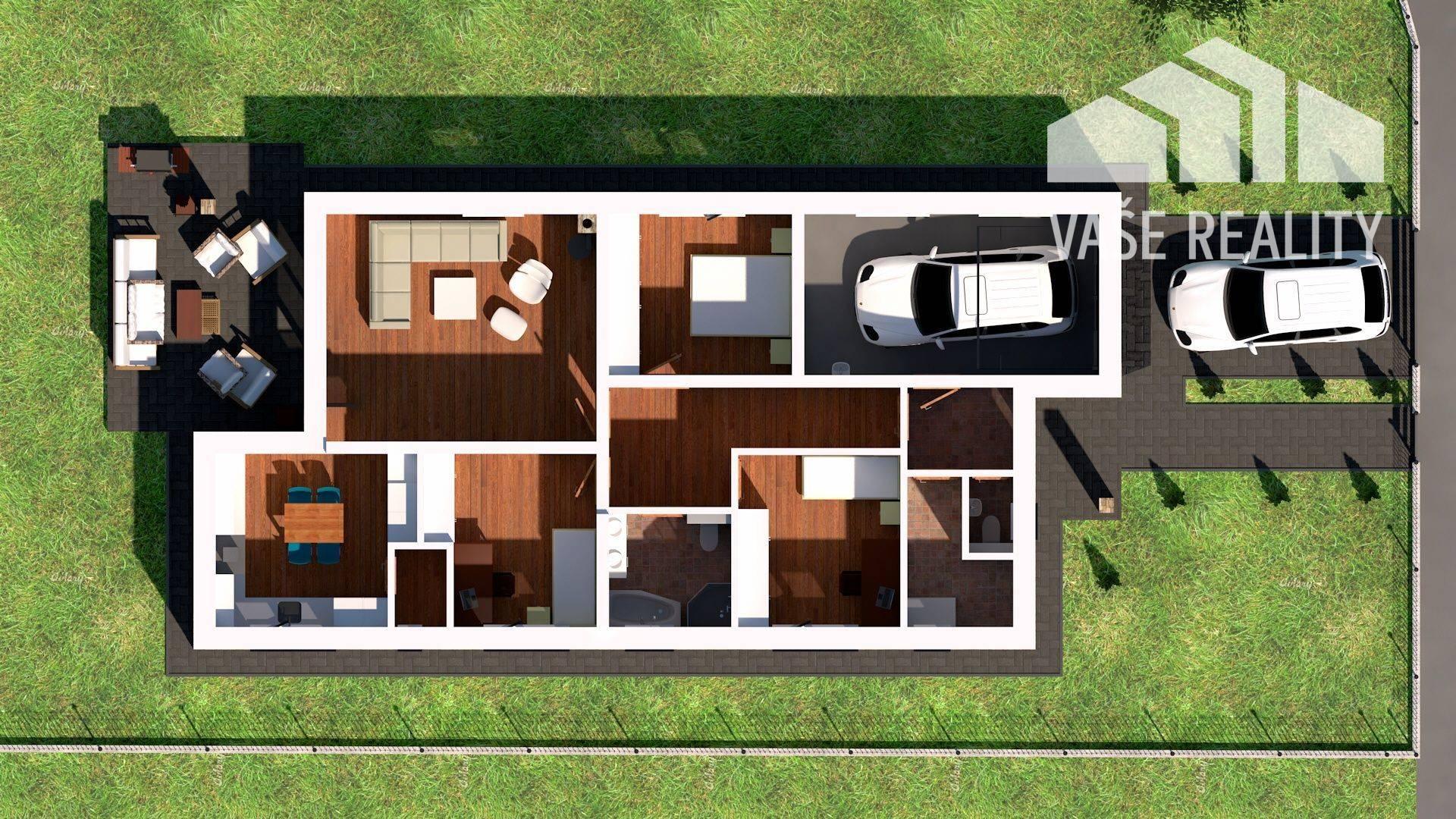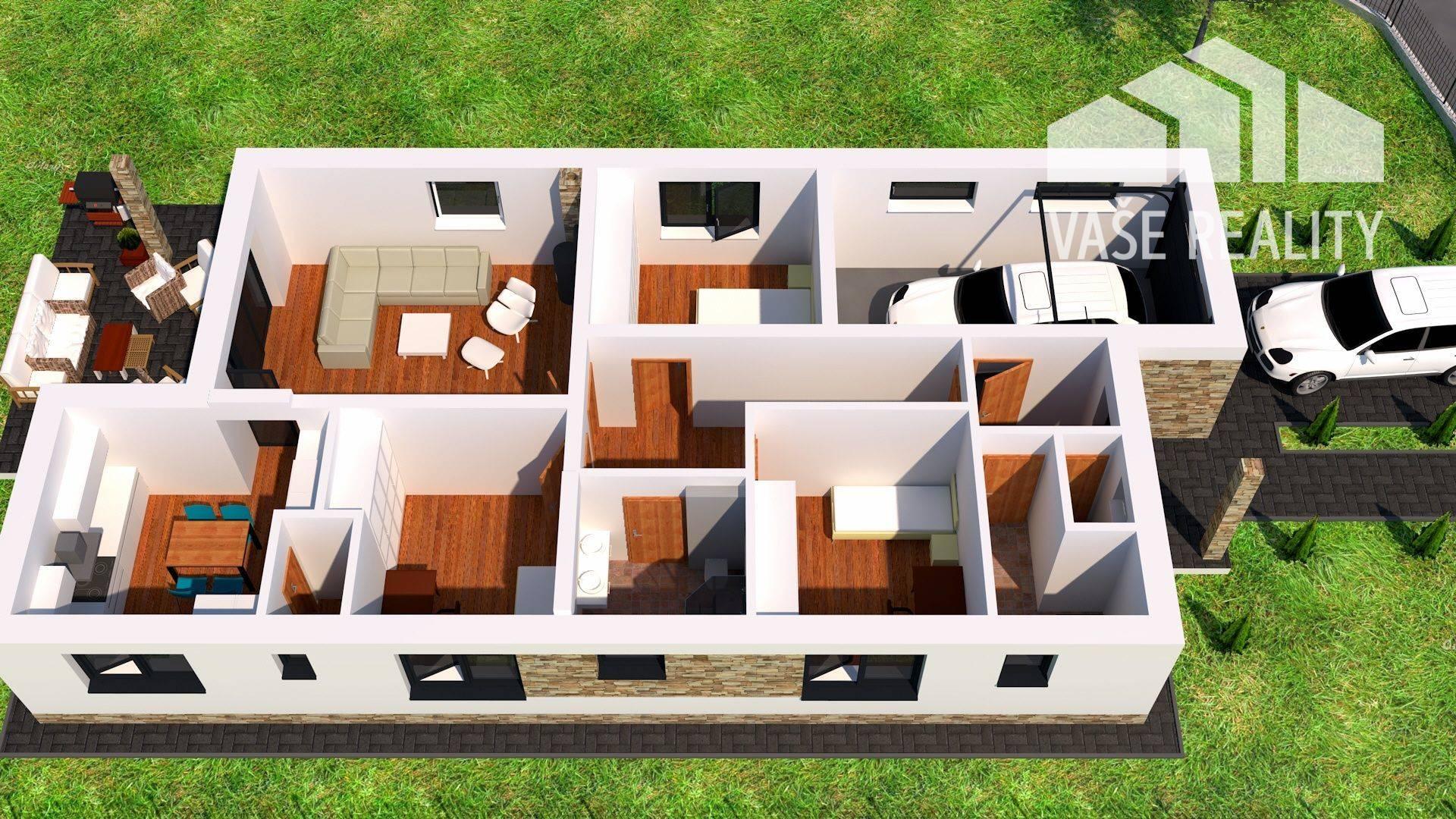 Dispozícia: zádverie, technická miestnosť, samostatné wc s umývadlom, chodba, kúpeľňa, 3 x izba, samostatná obývacia miestnosť s východom na terasu o rozlohe 26 m2, terasa má výmeru 23 m2, priečkou oddelená kuchyňa s jedálňou má 13,42 m2, špajza, garáž má výmeru 20 m2.