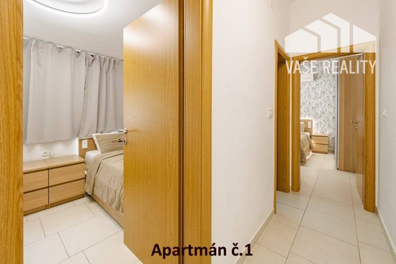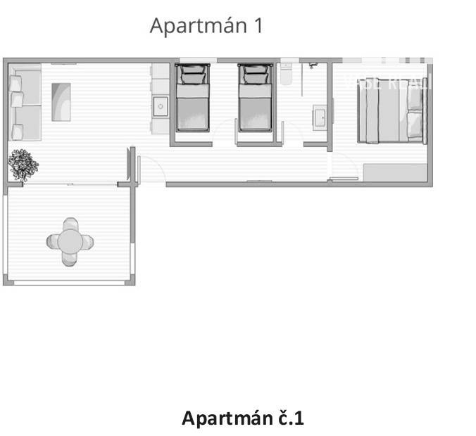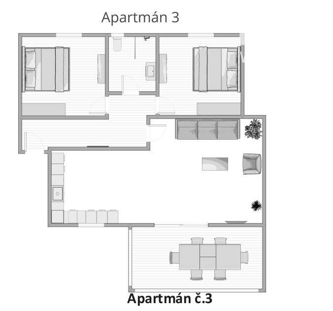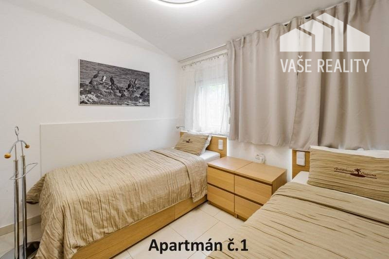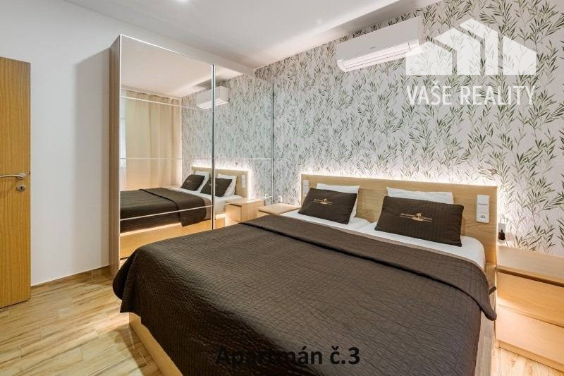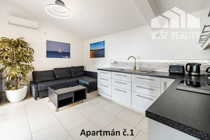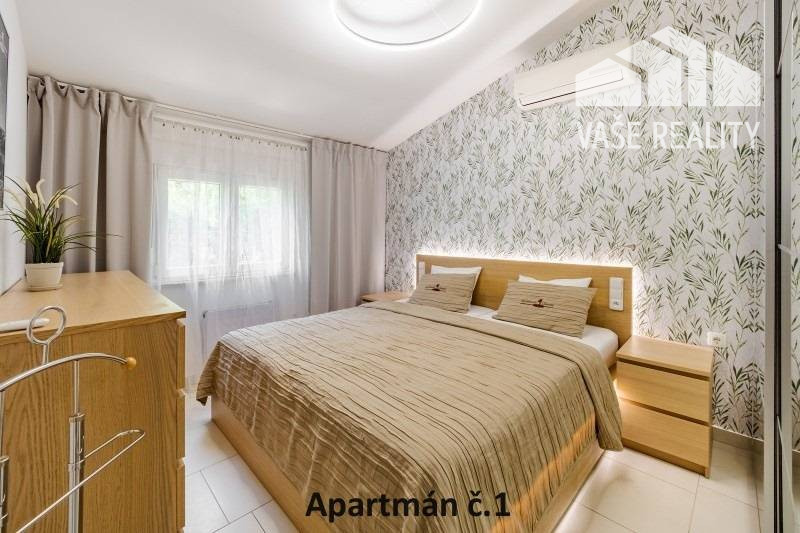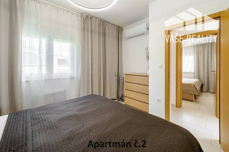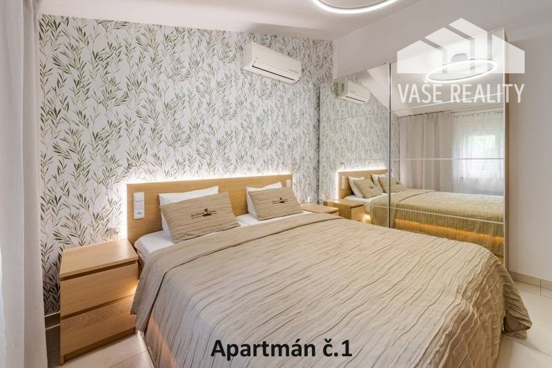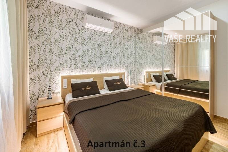 Kompletne a luxusne vybavené až šesťlôžkové apartmány o veľkosti 3+kk sa nachádzajú na prízemí a na poschodí. V samostatných apartmánoch sú 2 spálne s veľkou šatníkovou skriňou a manželskou posteľou s kvalitnými matracmi, pre nás vyrobenými na mieru so studenou pamäťovou penou, ktorá Vám zabezpečí dokonalý a pohodlný spánok. Apartmány disponujú rozľahlou obývačkou s pohodlnou rozkladacou pohovkou a LED TV, ktoré sú vybavené satelitom, na ktorom môžete sledovať české aj slovenské programy. Obývacia izba je prepojená s južne orientovanou terasou a poskytuje Vám dokonalé zázemie pre relax. Otvorená kuchyňa prepojená s obývacou izbou je vybavená umývačkou riadu, mikrovlnnou rúrou, chladničkou, kávovarom, rýchlovarnou kanvicou, vinotékou a sklokeramickou varnou doskou. Kúpeľňa je vybavená sprchovacím kútom, sušičom vlasov a práčkou. Pre vaše pohodlie sú všetky apartmány klimatizované. Apartmány na prvom poschodí majú kapacitu 4 dospelí a 2 deti do 10 rokov, spodný apartmán má kapacitu 4 osoby. K dispozícii je bezplatné parkovisko pod kamerovým dohľadom, plážové ležadlá, možnosť využitia elektrického kompresora na plážové vybavenie, bezplatný výrobník ľadových kociek, v celom areáli a na pláži môžete využívať bezplatné WiFi.