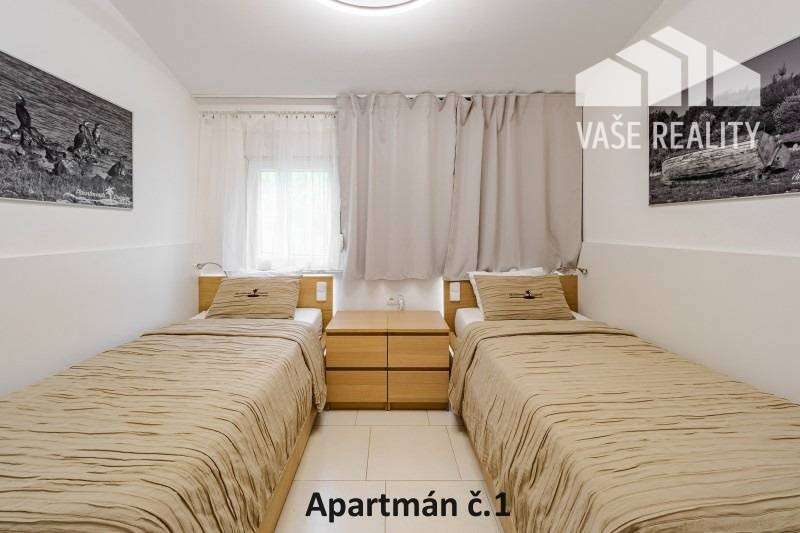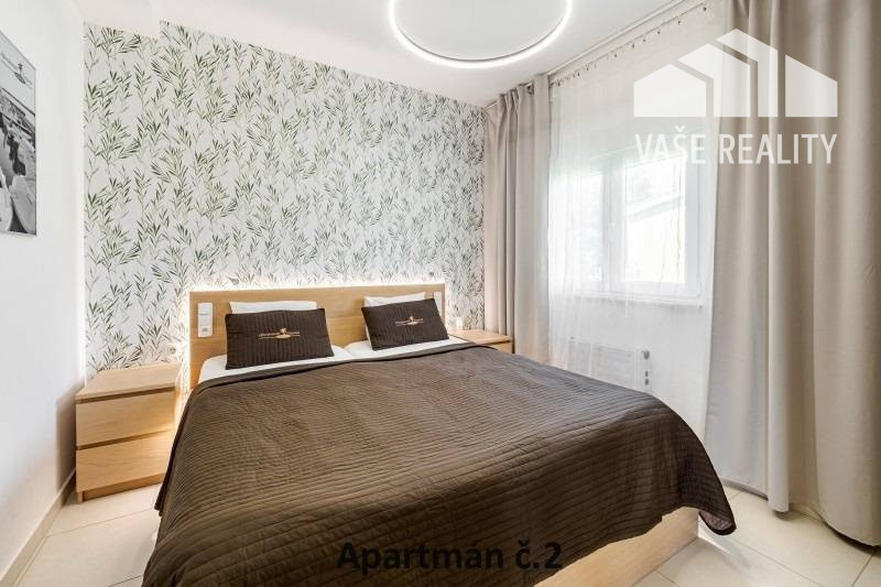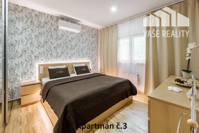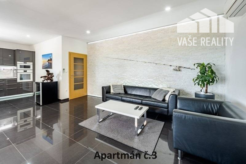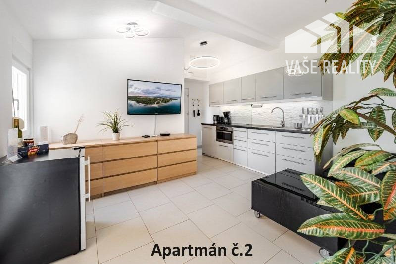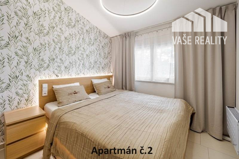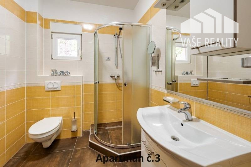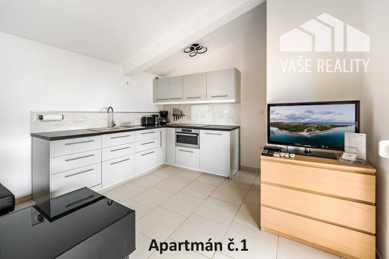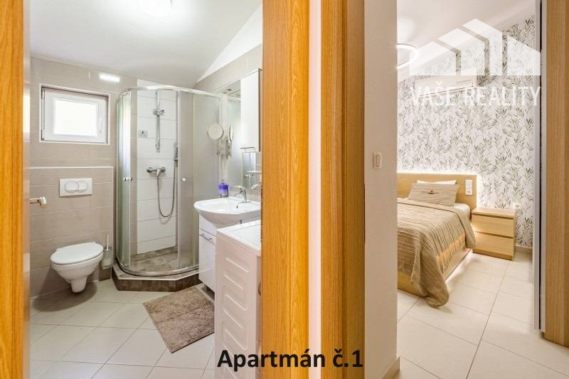 Kompletne a luxusne vybavené až šesťlôžkové apartmány o veľkosti 3+kk sa nachádzajú na prízemí a na poschodí. V samostatných apartmánoch sú 2 spálne s veľkou šatníkovou skriňou a manželskou posteľou s kvalitnými matracmi, pre nás vyrobenými na mieru so studenou pamäťovou penou, ktorá Vám zabezpečí dokonalý a pohodlný spánok. Apartmány disponujú rozľahlou obývačkou s pohodlnou rozkladacou pohovkou a LED TV, ktoré sú vybavené satelitom, na ktorom môžete sledovať české aj slovenské programy. Obývacia izba je prepojená s južne orientovanou terasou a poskytuje Vám dokonalé zázemie pre relax. Otvorená kuchyňa prepojená s obývacou izbou je vybavená umývačkou riadu, mikrovlnnou rúrou, chladničkou, kávovarom, rýchlovarnou kanvicou, vinotékou a sklokeramickou varnou doskou. Kúpeľňa je vybavená sprchovacím kútom, sušičom vlasov a práčkou. Pre vaše pohodlie sú všetky apartmány klimatizované. Apartmány na prvom poschodí majú kapacitu 4 dospelí a 2 deti do 10 rokov, spodný apartmán má kapacitu 4 osoby. K dispozícii je bezplatné parkovisko pod kamerovým dohľadom, plážové ležadlá, možnosť využitia elektrického kompresora na plážové vybavenie, bezplatný výrobník ľadových kociek, v celom areáli a na pláži môžete využívať bezplatné WiFi.