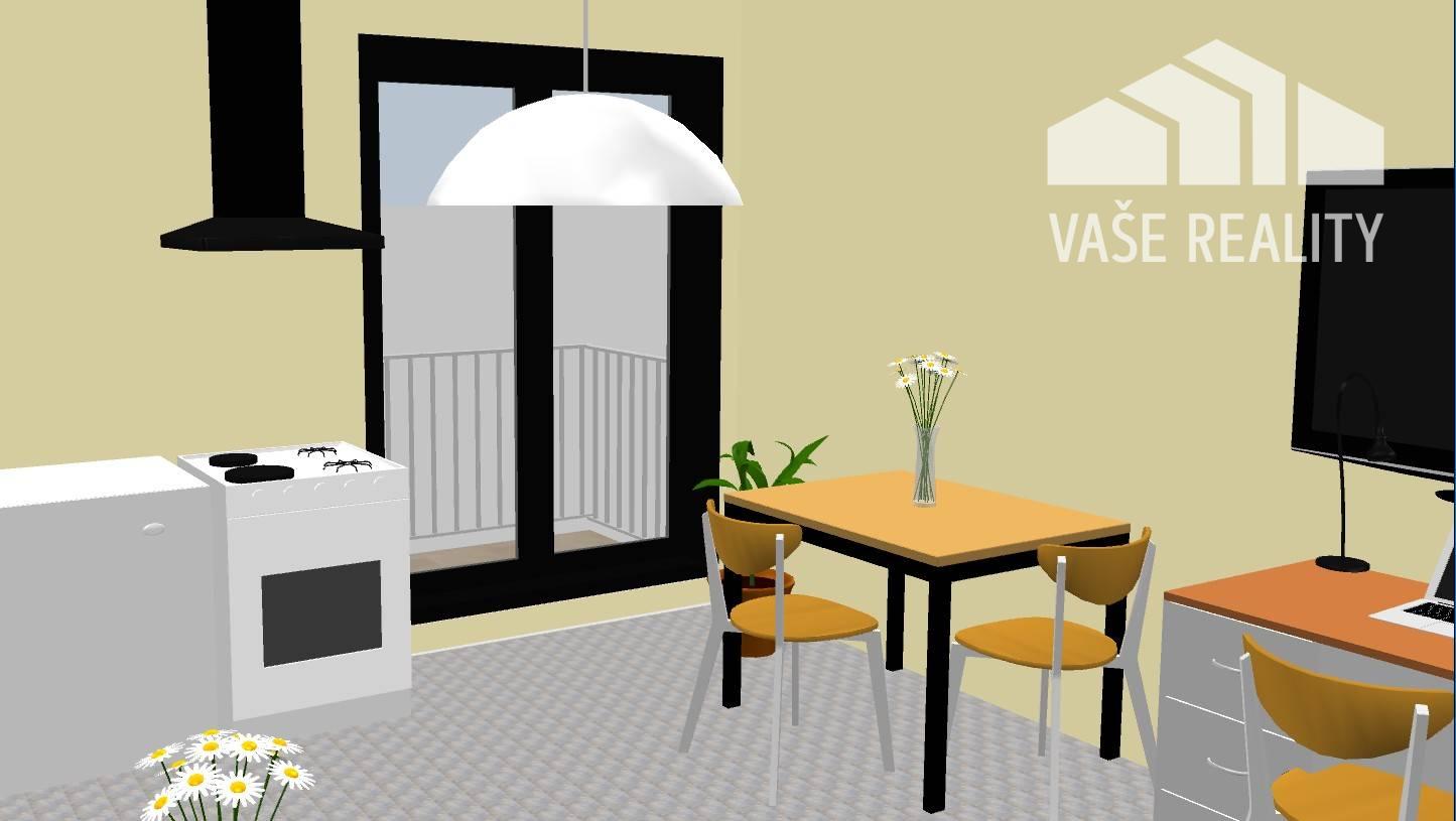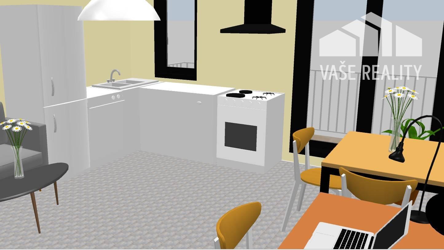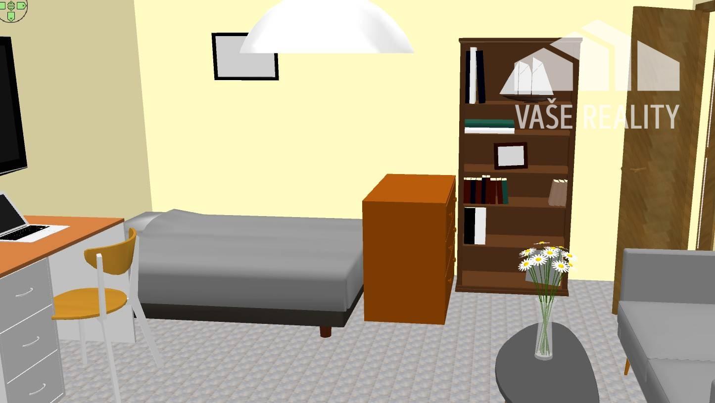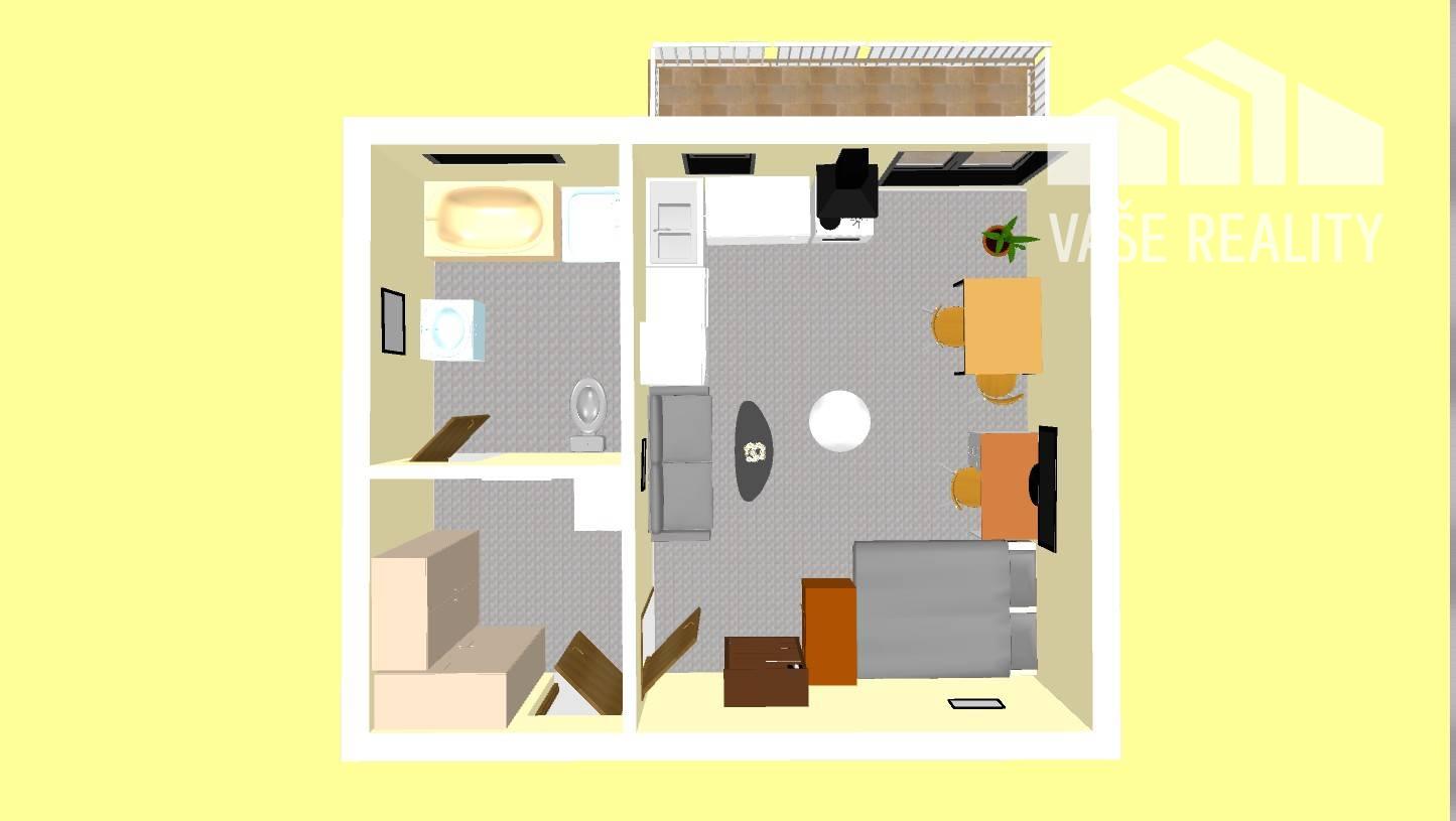Dispozícia bytu: chodba, kúpeľňa s WC, spálňa s kuchynským kútom, balkón
