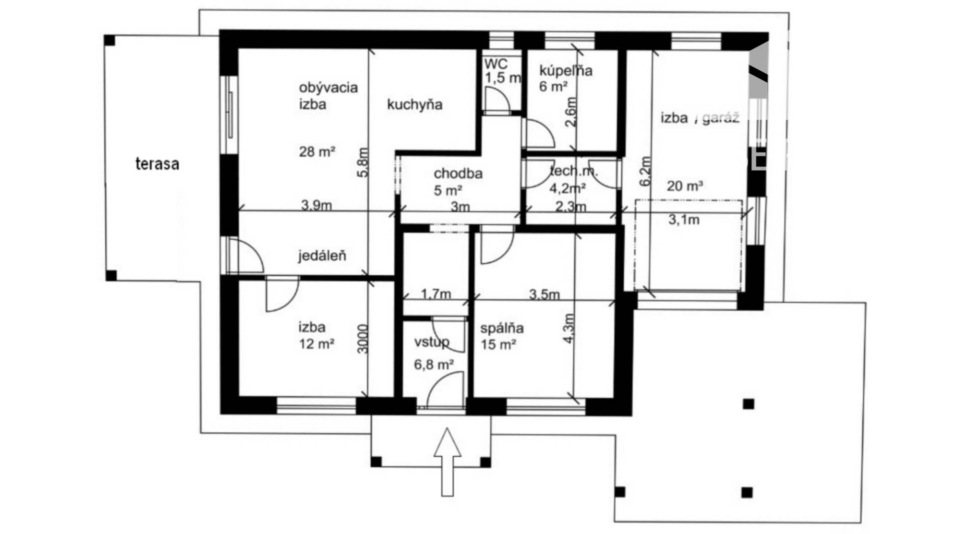 Zádverie 6,8 m², predsieň 5 m², technická miestnosť 4,2 m², obývacia izba s kuchyňou 28 m², spálňa 12 m², druhá spálňa 15 m², izba (alebo garáž) 20 m², kúpeľňa 6 m², samostatné WC 1,5 m², terasa 18,5 m².
