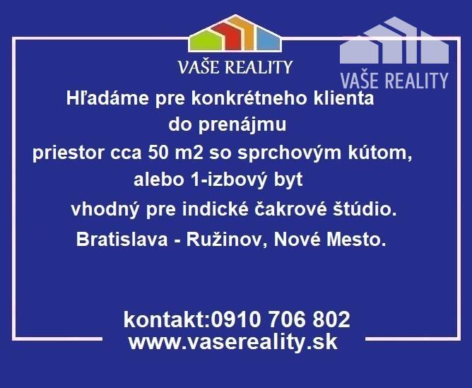 Pre nášho klienta hľadáme do prenájmu priestor s rozlohou približne 50-70 m² v lokalitách Bratislavy – Nové Mesto, Ružinov, ktorý by bol vhodný na indické čakrové štúdio.
