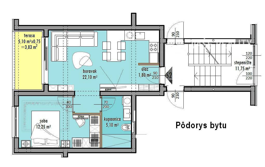 Byt pozostáva zo vstupu, kuchyne s jedálňou a obývacou izbou, kúpeľne, 1 spálne a krytej terasy - loggie.