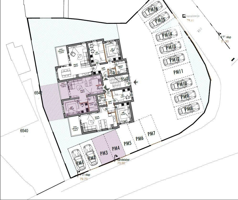 K bytu prislúcha komora SP2 o rozlohe 5,10m2 v suteréne budovy a 2 vonkajšie parkovacie státia PM3 a PM4 s rozlohou 13,75m2.