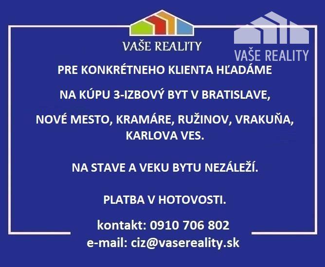 Pre konkrétneho klienta hľadáme 3-izbový byt v Bratislave, v m.č. Nové Mesto, Kramáre, Karlova Ves, Ružinov, Vrakuňa. Na stave a veku bytu nezáleží. Platba v hotovosti.