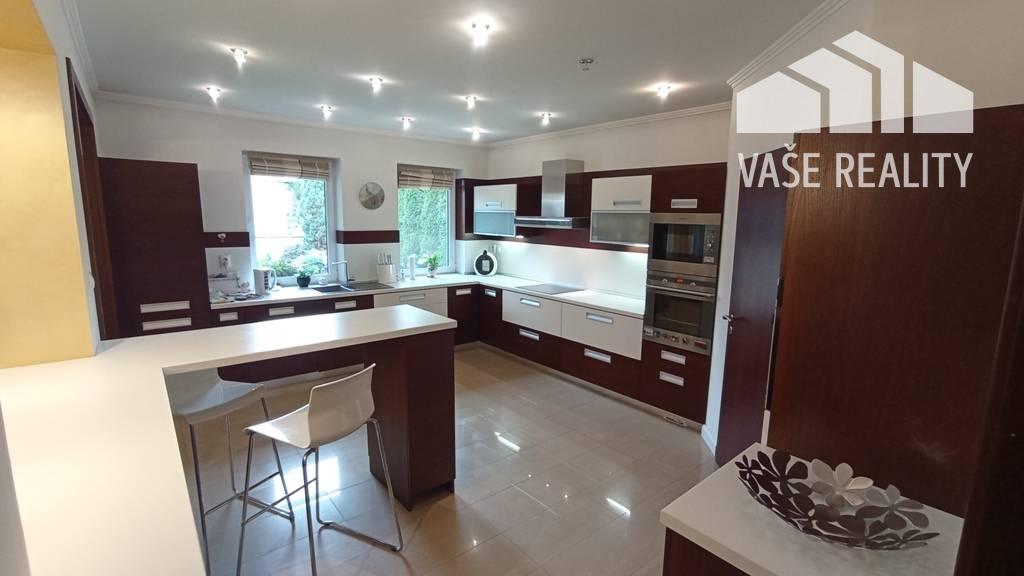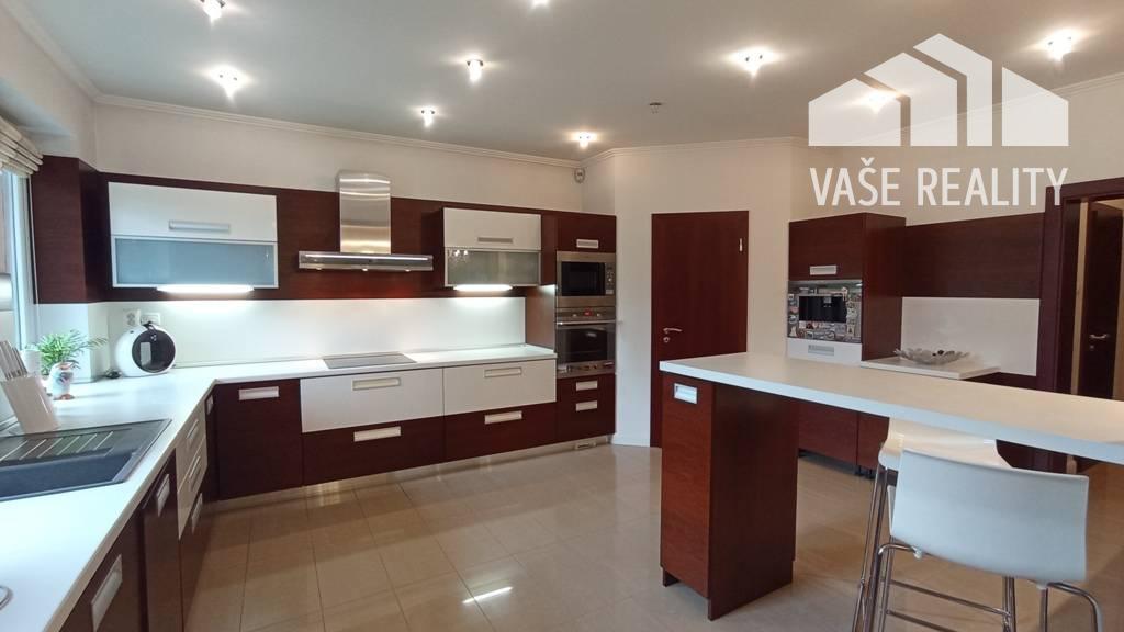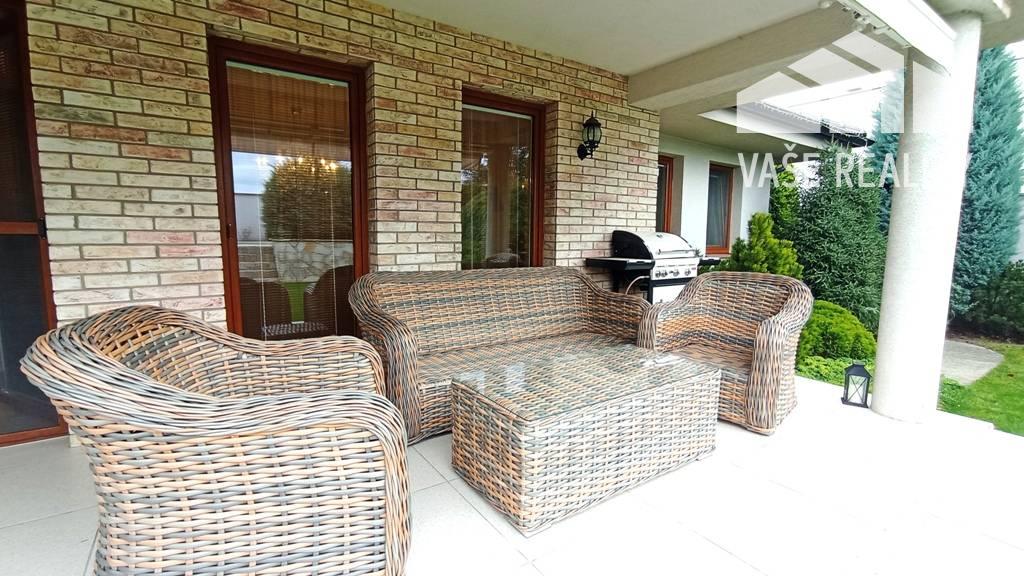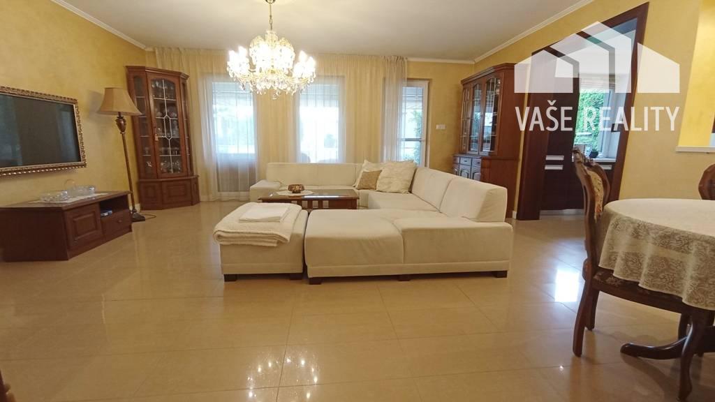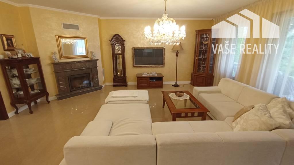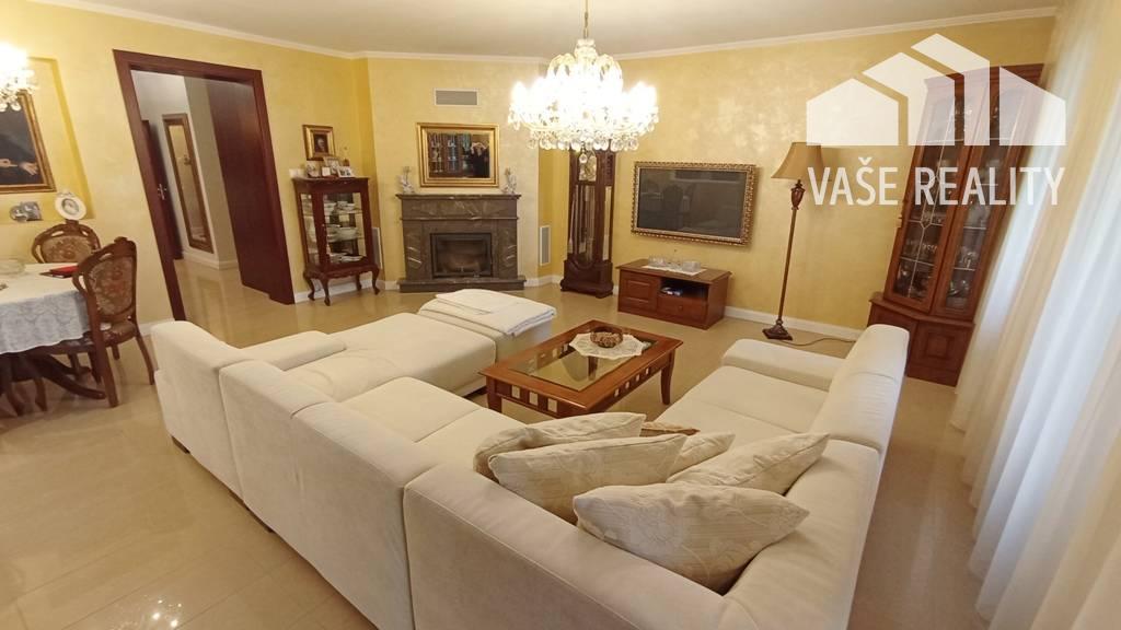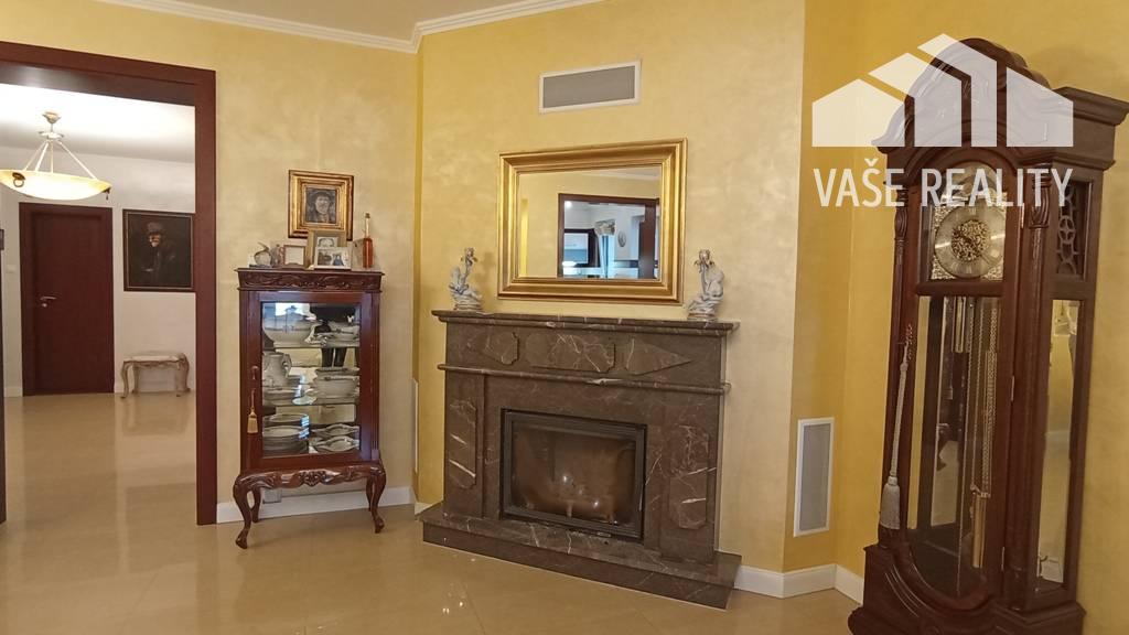Dispozícia: centrom domu je priestranná obývacia izba s luxusným mramorovým krbom a východom na terasu, prepojená s veľkou modernou kuchyňou s výhľadom do záhrady, 4 samostatné spálne, kúpeľňa, špajza, technická miestnosť / práčovňa, samostatná toaleta, vstupná chodba a veľká chodba.