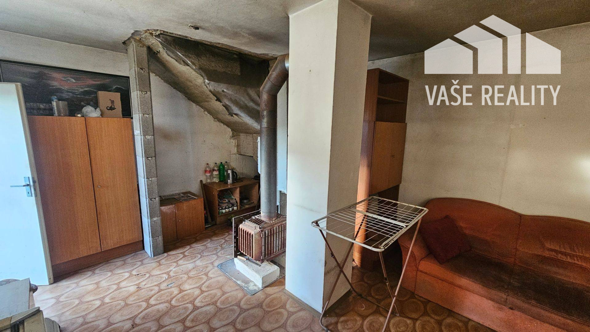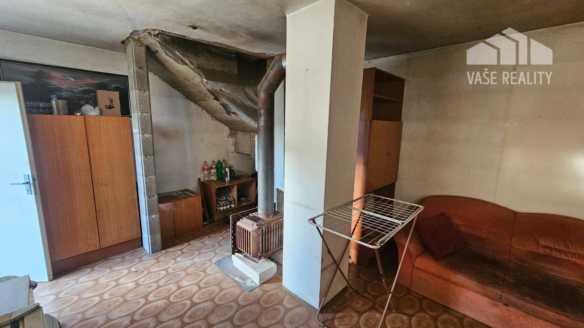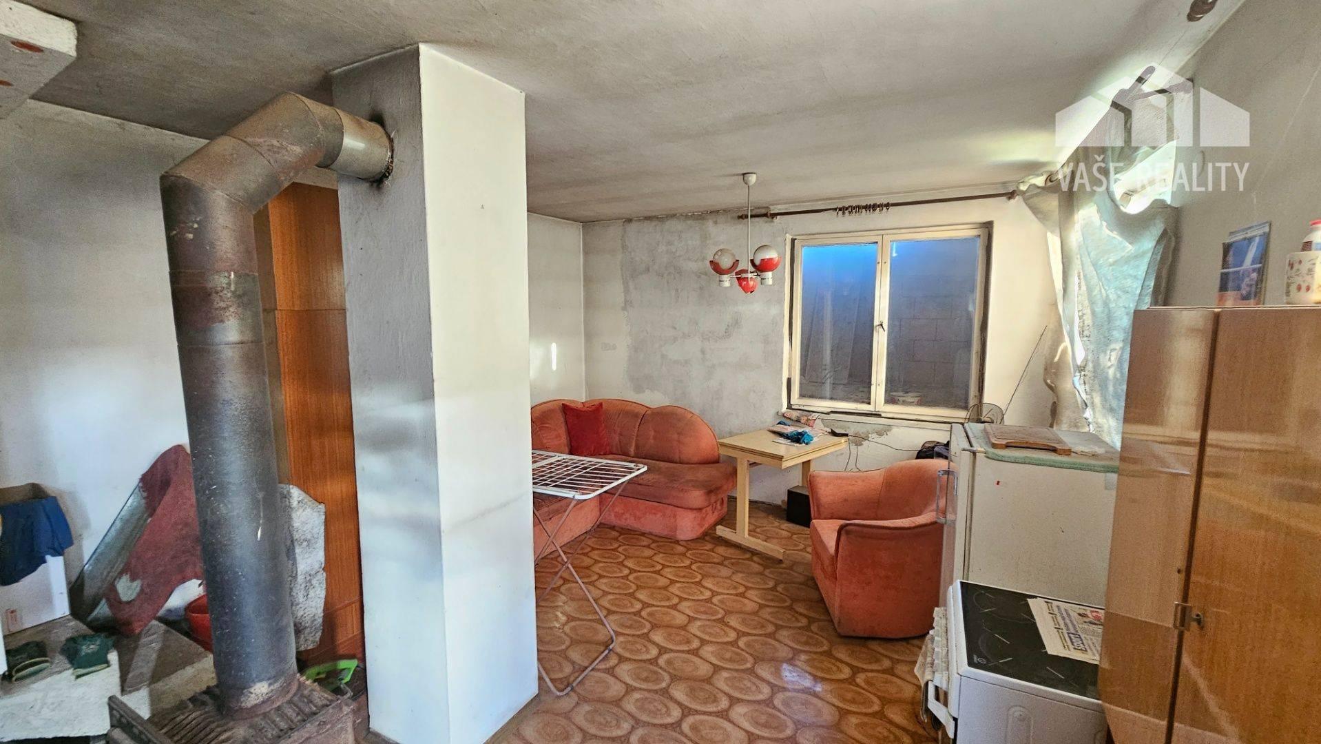DISPOZÍCIA PRÍZEMIA: obývačka s kuchynským kútom s prípravou na krb do komína, nedokončená kúpeľňa s WC (prístavba), železobetónové schodisko do podkrovia. DISPOZÍCIA PODKROVIA: spálňa s výstupom na nedokončenú terasu (prístavba). DISPOZÍCIA SUTERÉNU: schodisko, 2x sklad.