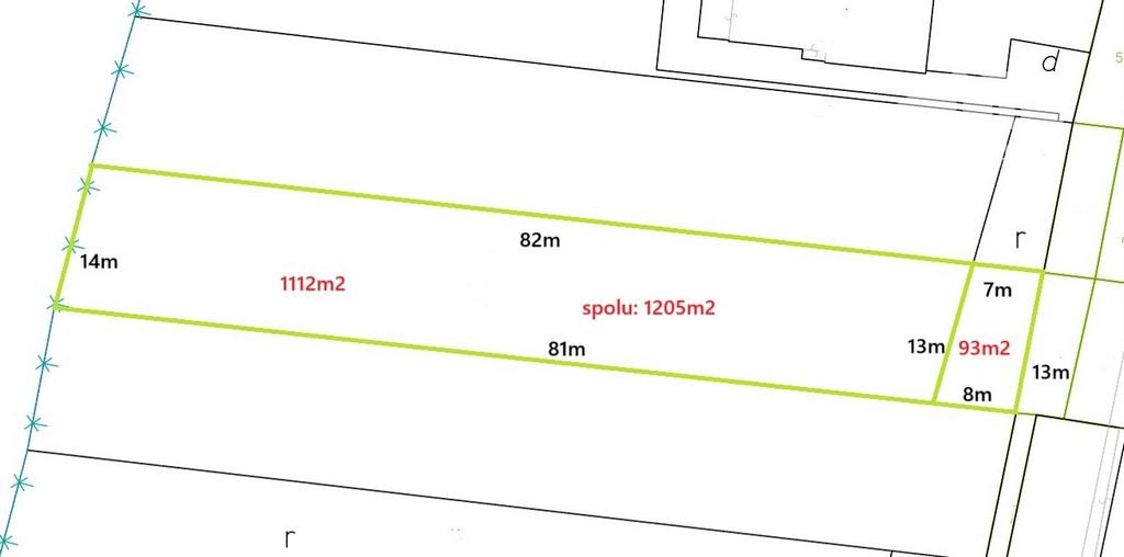 Pozemok je z dvoch parciel o celkovej výmere 1205m2 (viď. obrázok), IS ( elektrika, plyn) sú dobudované a nachádzajú sa na hranici pozemku. Pozemok sa nachádza v tichej časti obce mimo hlavnej cesty, k pozemku vedie asfaltová obecná komunikácia.