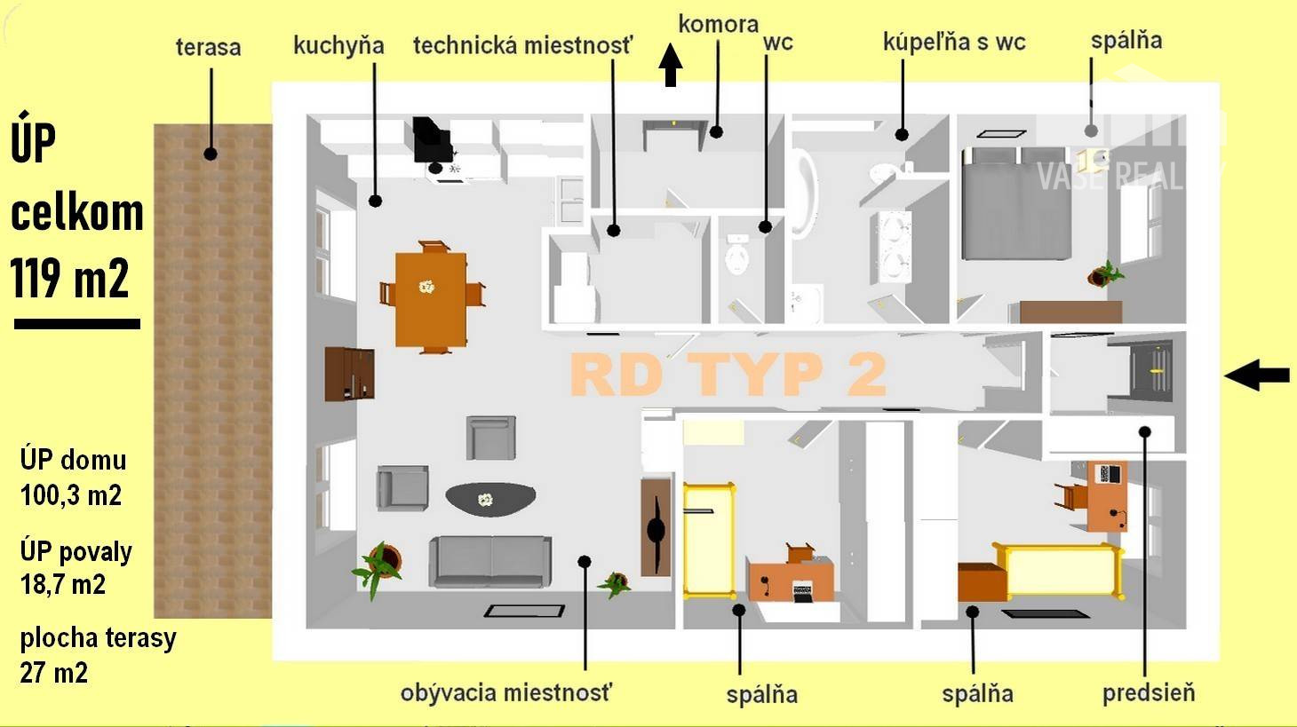 Dom má 2x WC, kúpeľňu s vaňou a WALK IN sprchovým kútom, špajzu, technickú miestnosť, obývačku spojenú s kuchyňou, a 3 spálne. Terasa zo zámkovej dlažby má rozlohu 27 m².