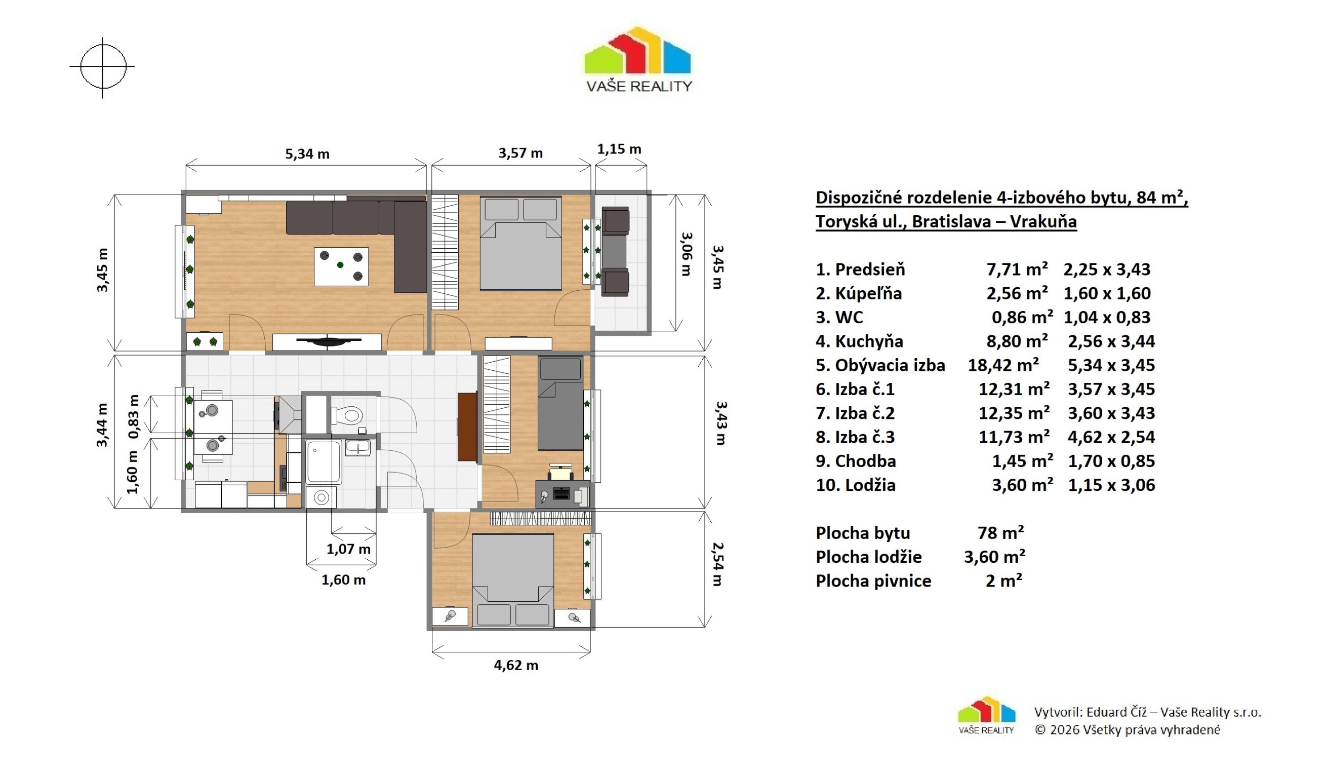 • 84 m² (78 m² byt + 3,6 m² lodžia + 2 m² pivnica)