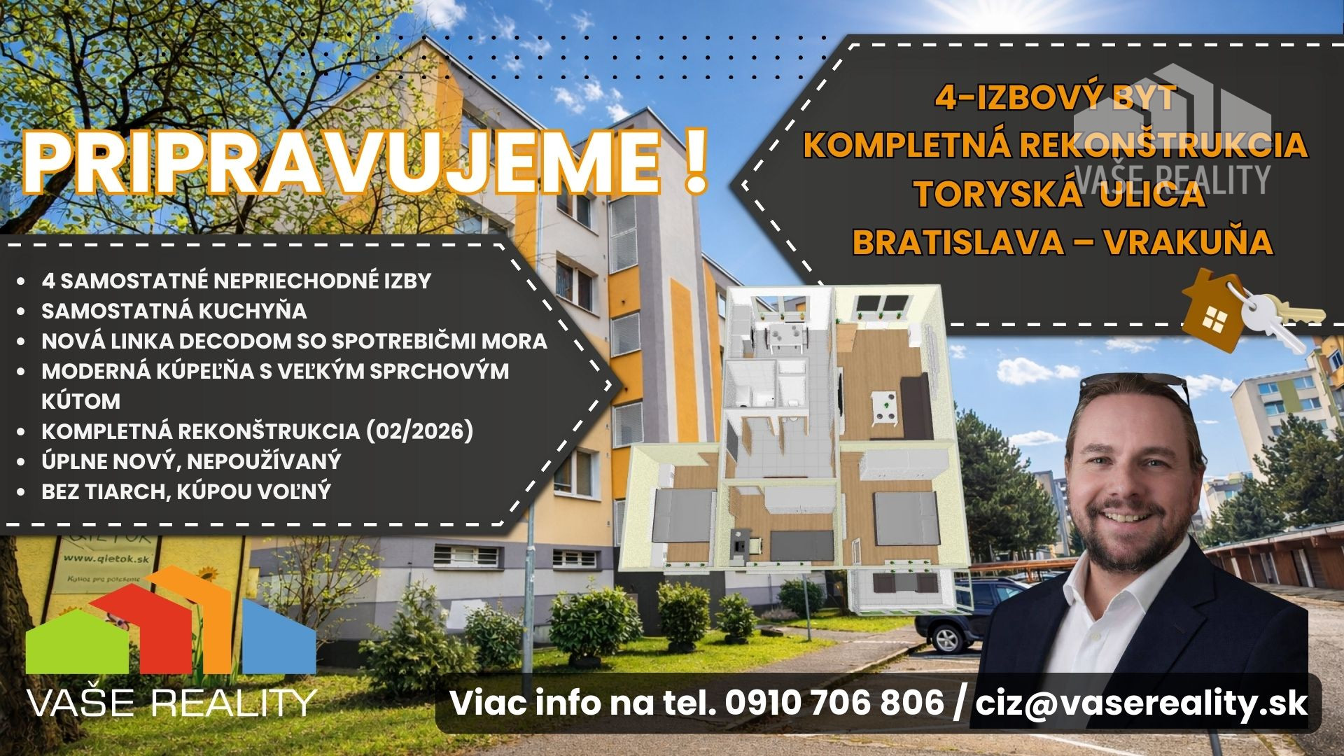 Tento nadštandardne zrekonštruovaný 4-izbový byt sa nachádza na Toryskej ulici v mestskej časti Bratislava – Vrakuňa. Rekonštrukcia prebieha vo februári 2026 – byt bude odovzdaný ako úplne nový, bez predchádzajúceho užívania.