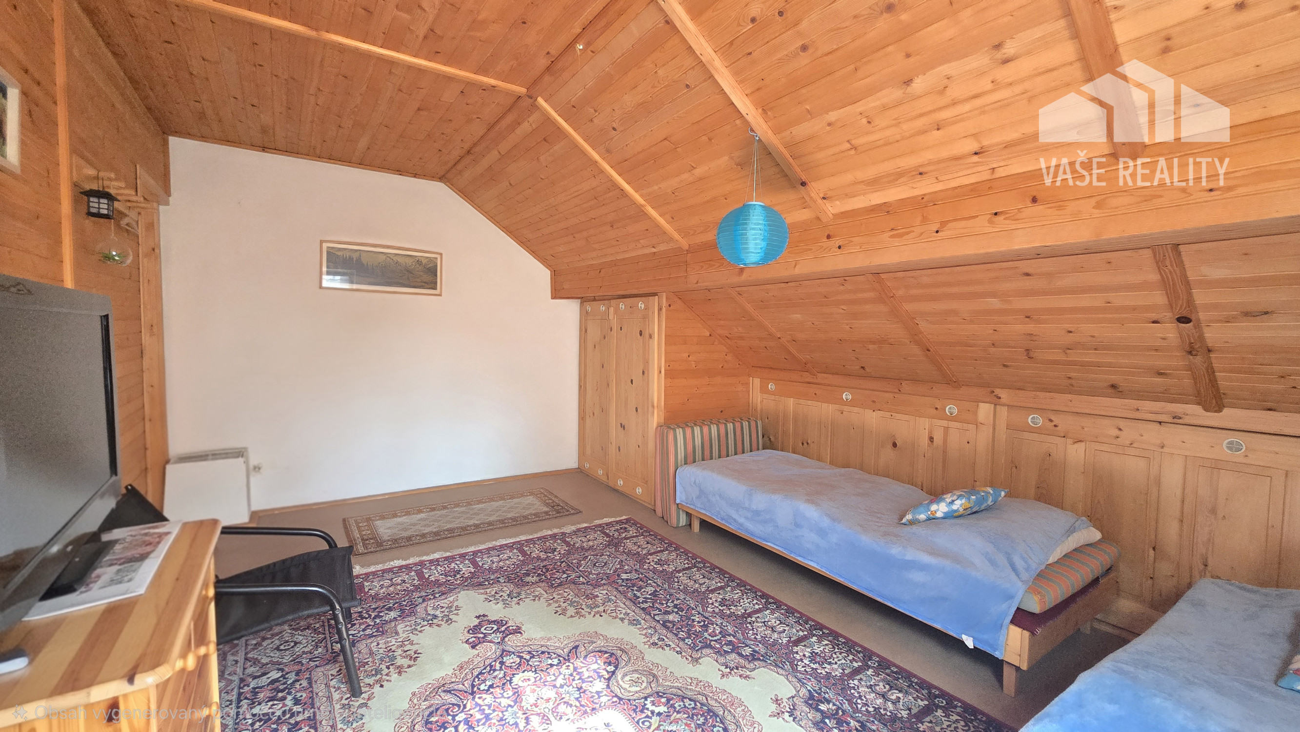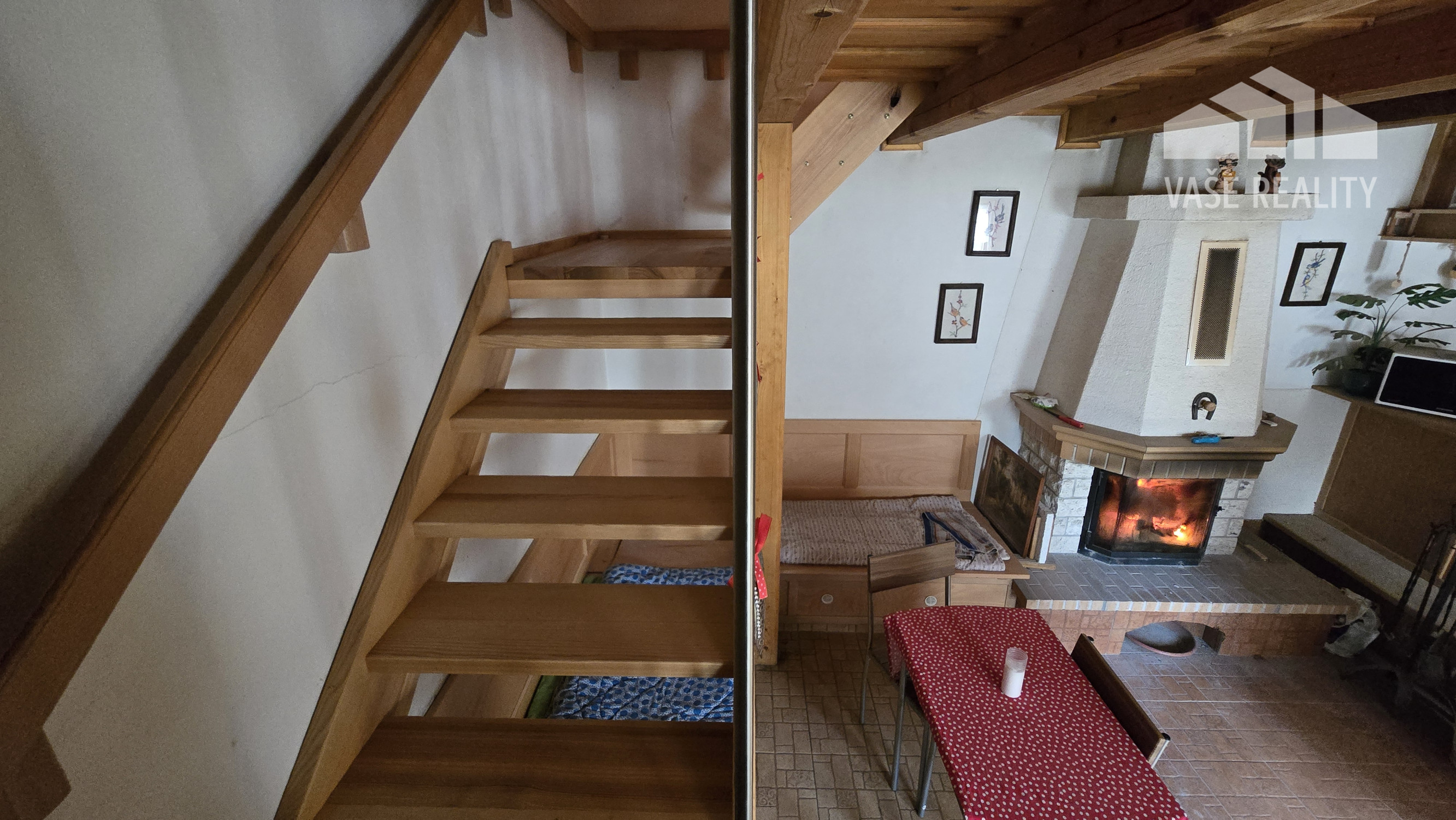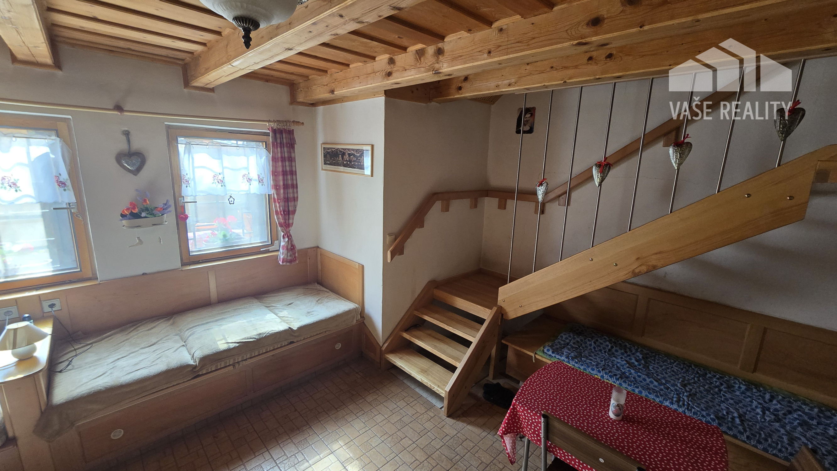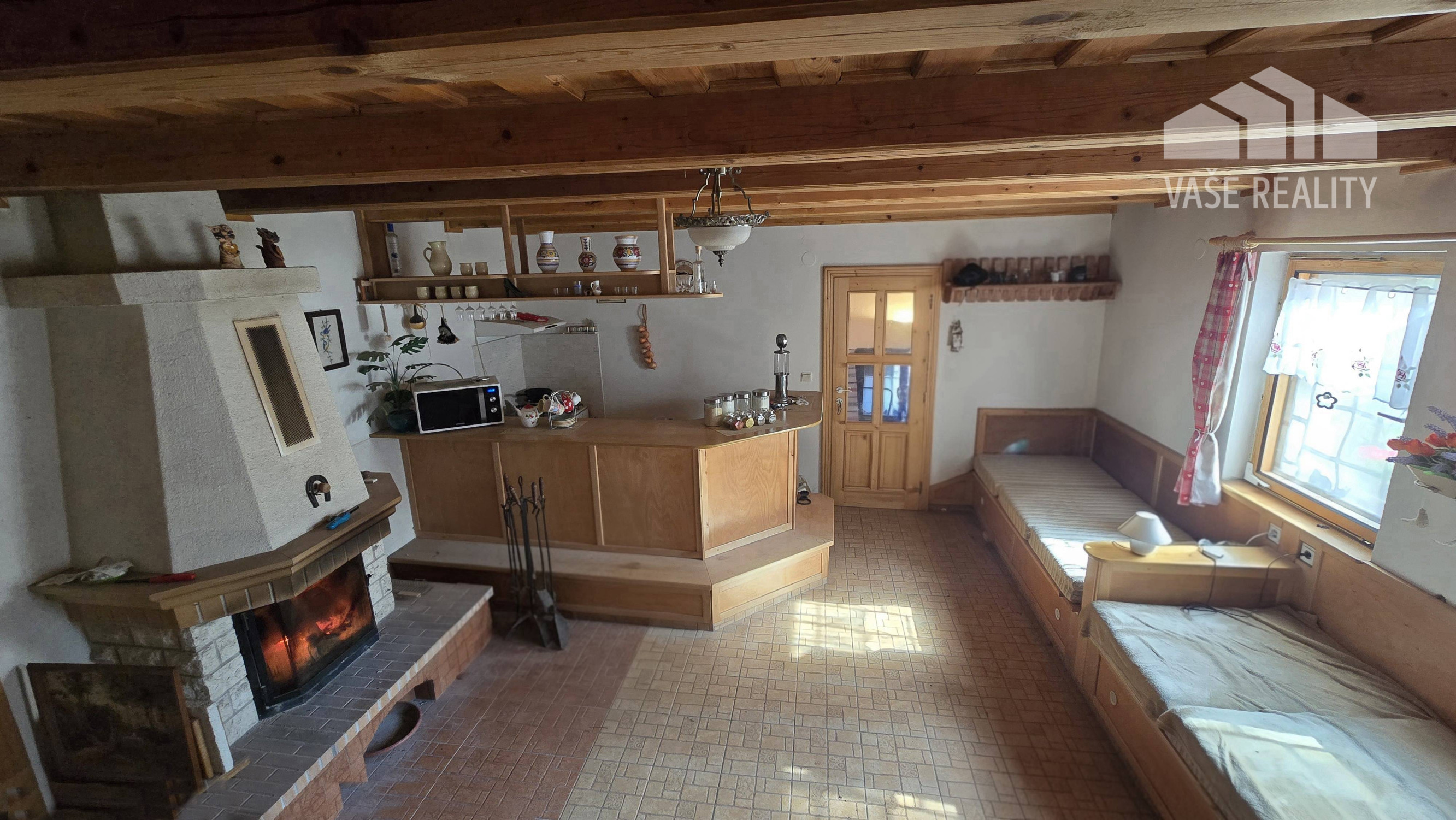 Chata ponúka prakticky riešený priestor s dennou časťou, kuchyňou, kúpeľňou a nočnou časťou na poschodí.