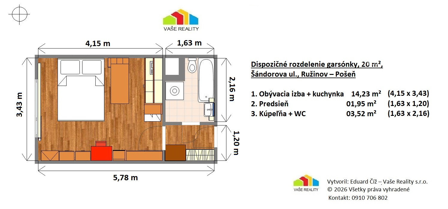 Kompletný text ponuky, vizualizáciu inzerátu, fotografie, pôdorys pripravil certifikovaný maklér Eduard Číž. Ak by ste aj Vy chceli profesionálne pripravený inzerát a ponuku, bezpečný predaj /prenájom Vašej nehnuteľnosti, stačí ma kontaktovať na čísle 0910 706 802.